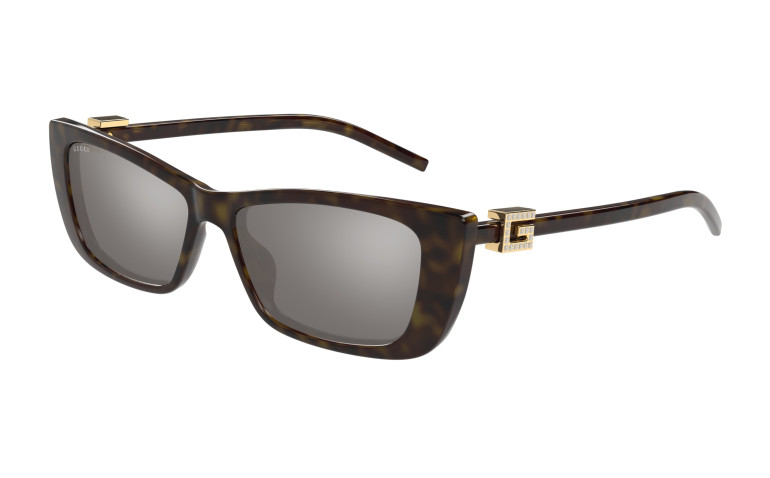 Monture fine en plastique au look et au style années 90, ornée d'un logo G carré unique sur la branche. Monture œil-de-chat rectangulaire. Construction injectée avec branches ornées d'un logo G carré en métal. Palette de couleurs féminines unies, rehaussée de logos avec strass uniques.