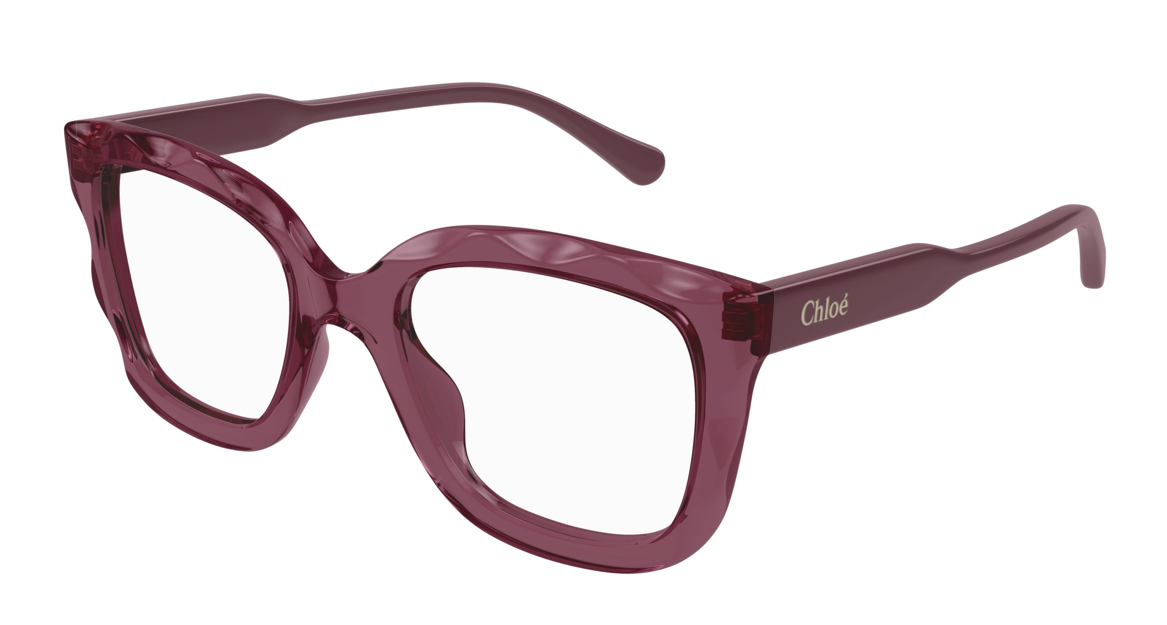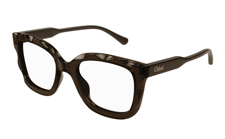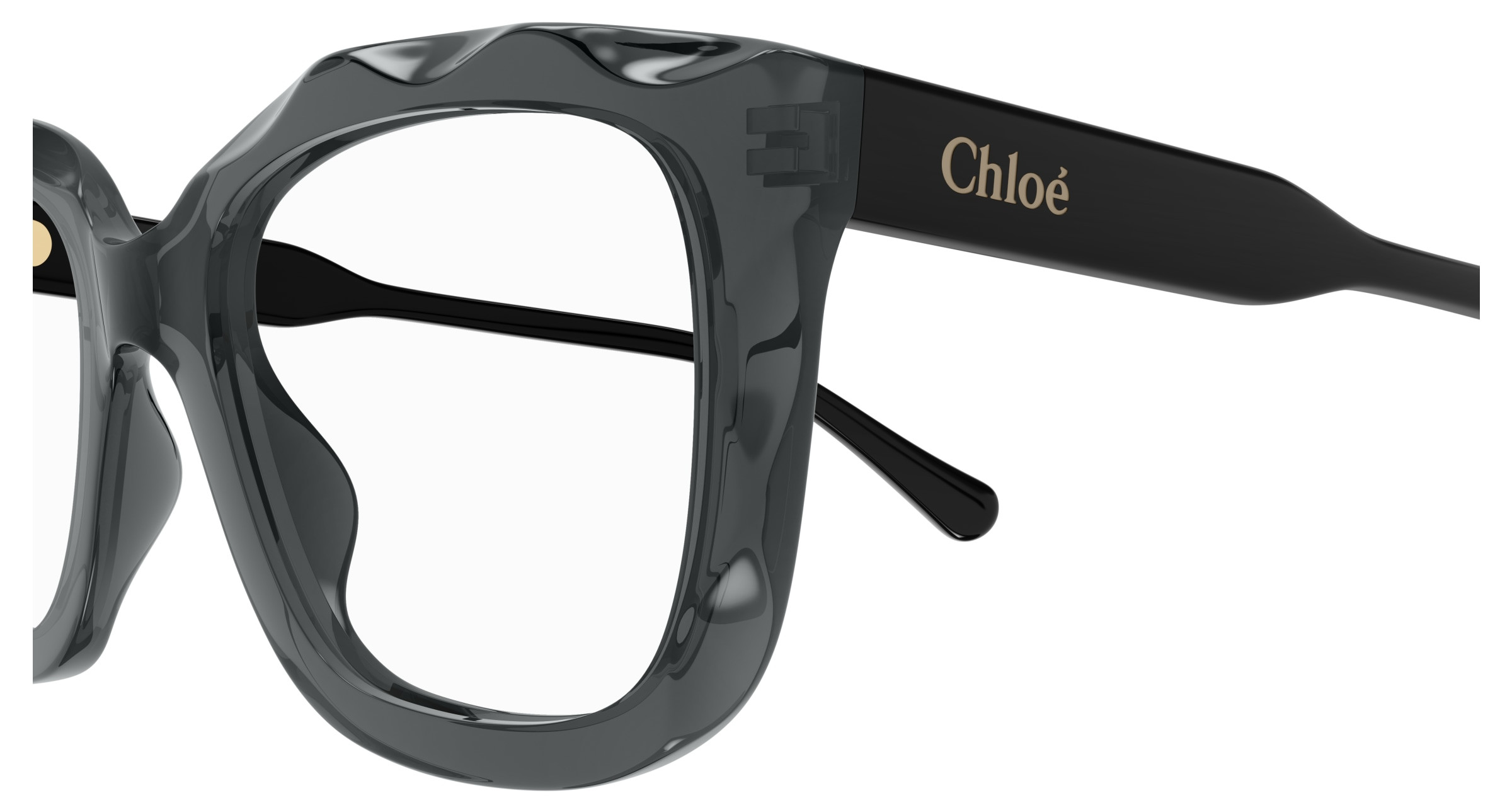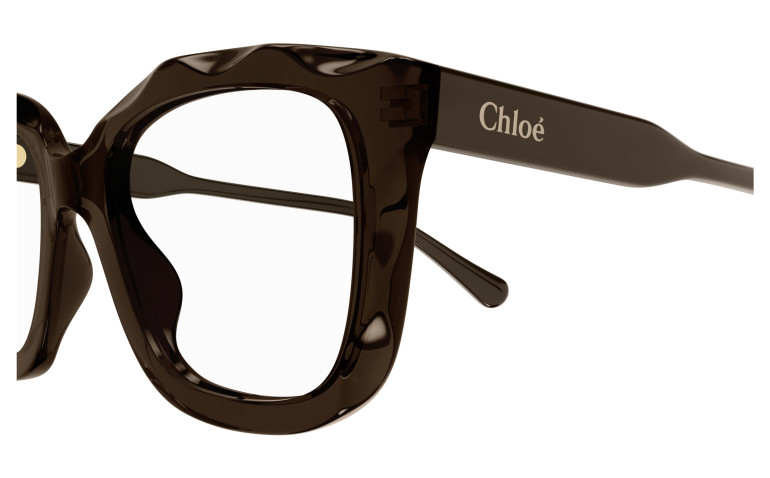 Monture rectangulaire arrondie et oversize en acétate avec motif festonné sur le cercle. Cercle de couleur transparente associé à des branches unies ton sur ton. Logo Chloé gravé au laser et émaillé sur les branches.