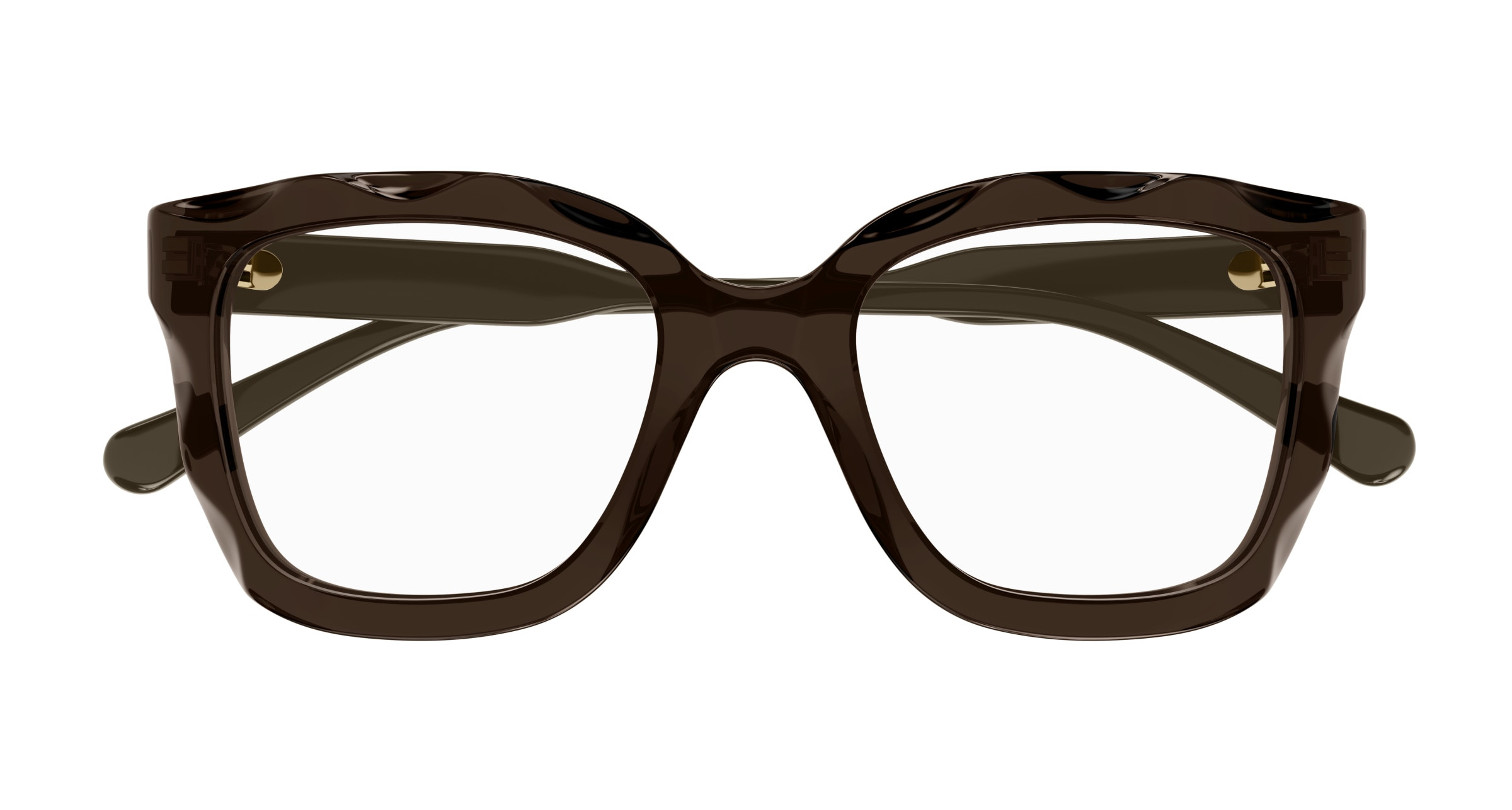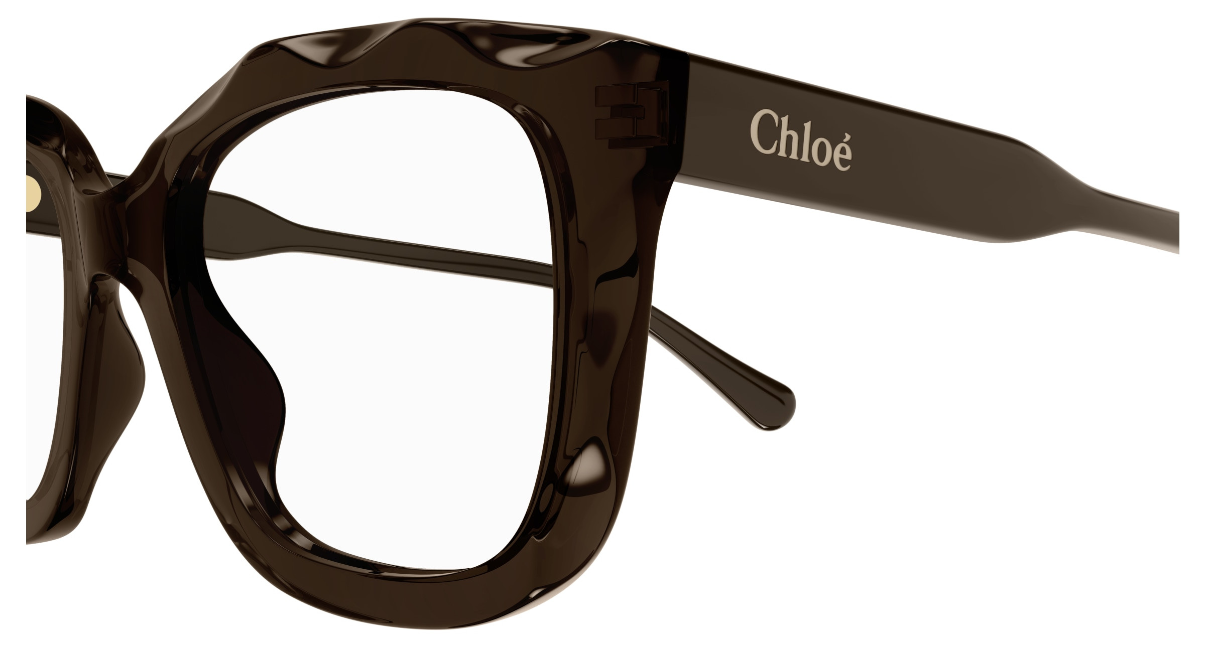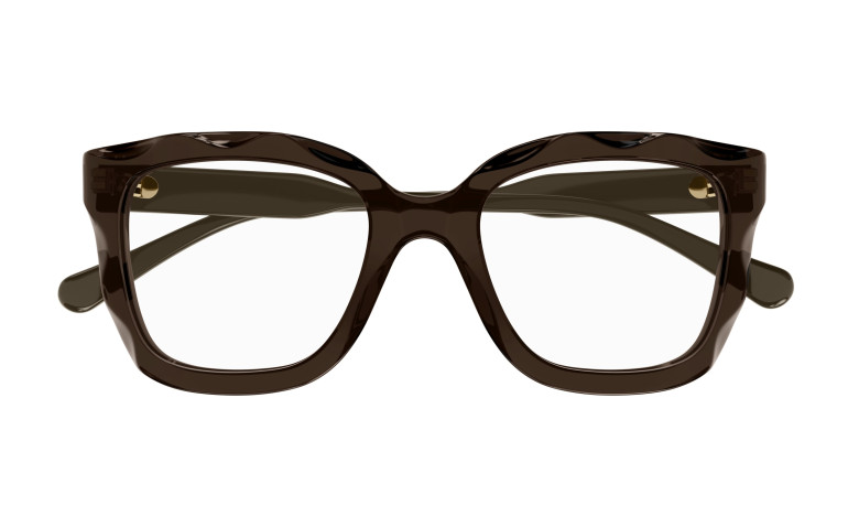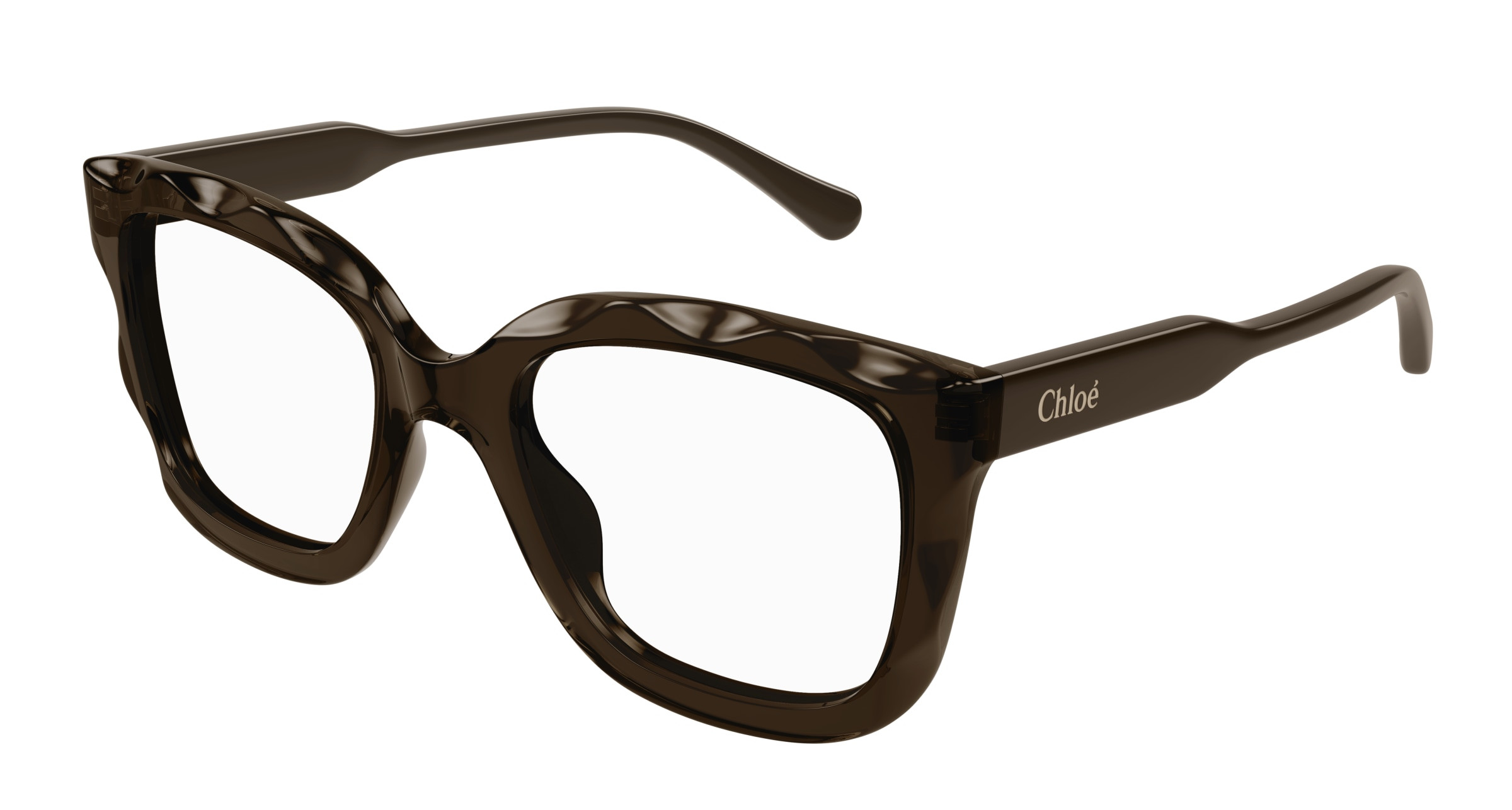 Monture rectangulaire arrondie et oversize en acétate avec motif festonné sur le cercle. Cercle de couleur transparente associé à des branches unies ton sur ton. Logo Chloé gravé au laser et émaillé sur les branches.