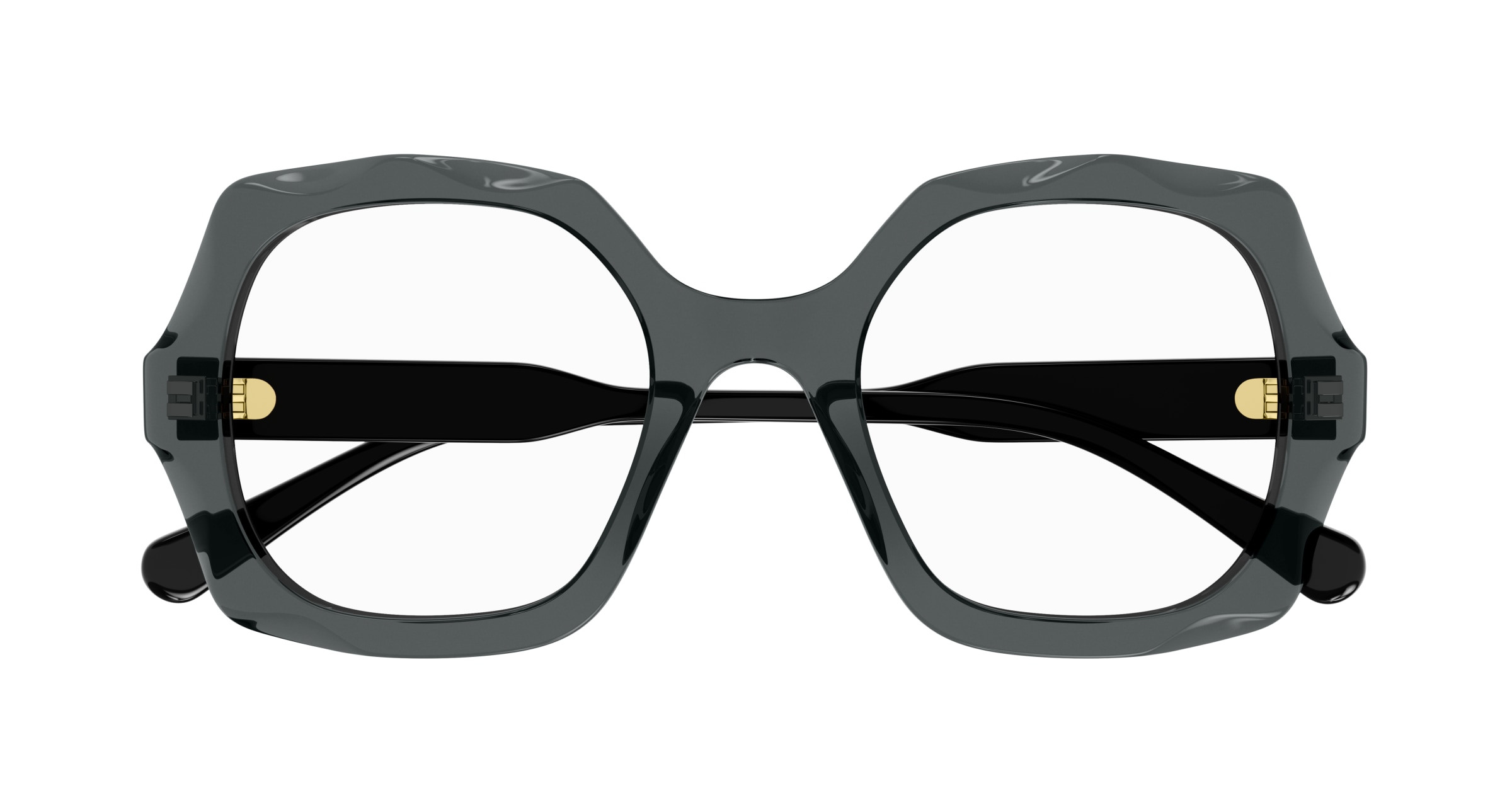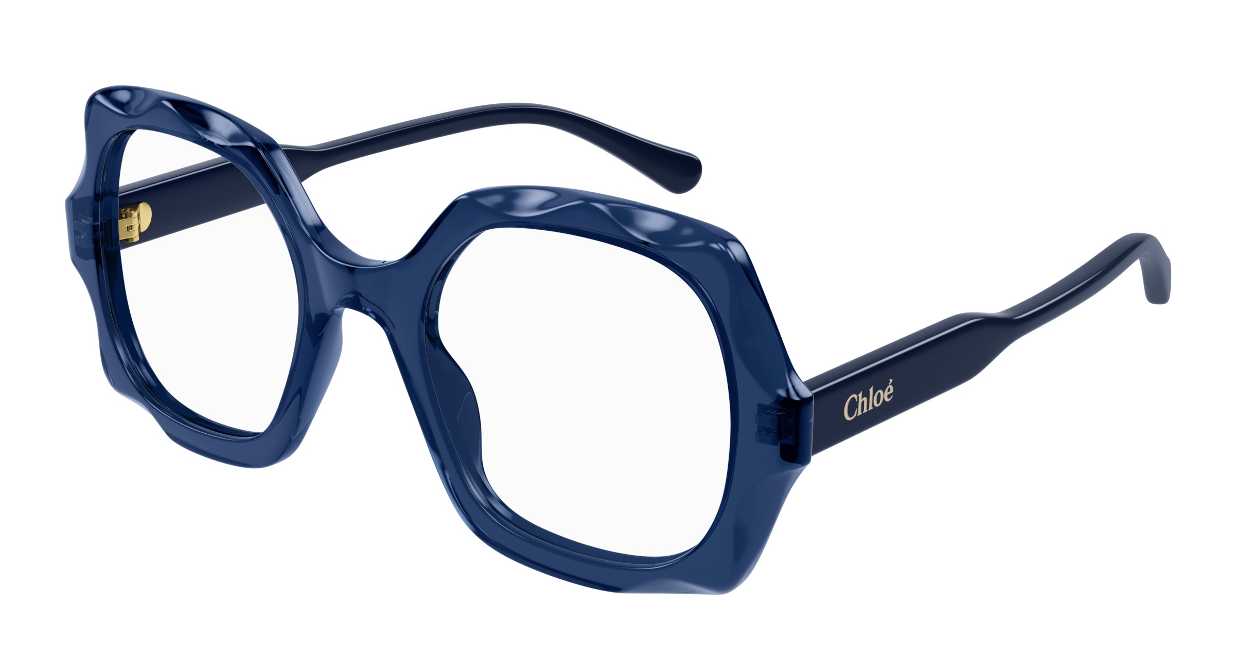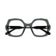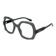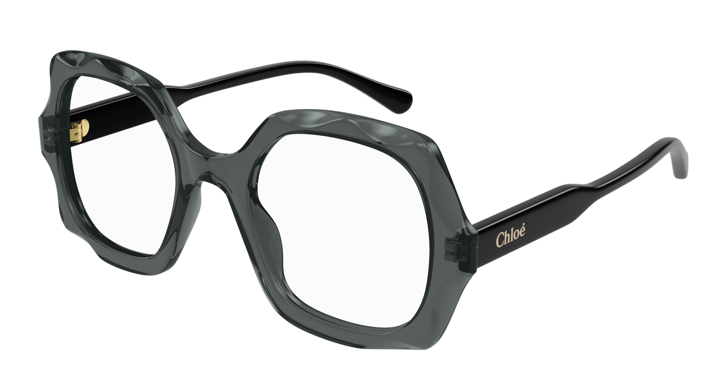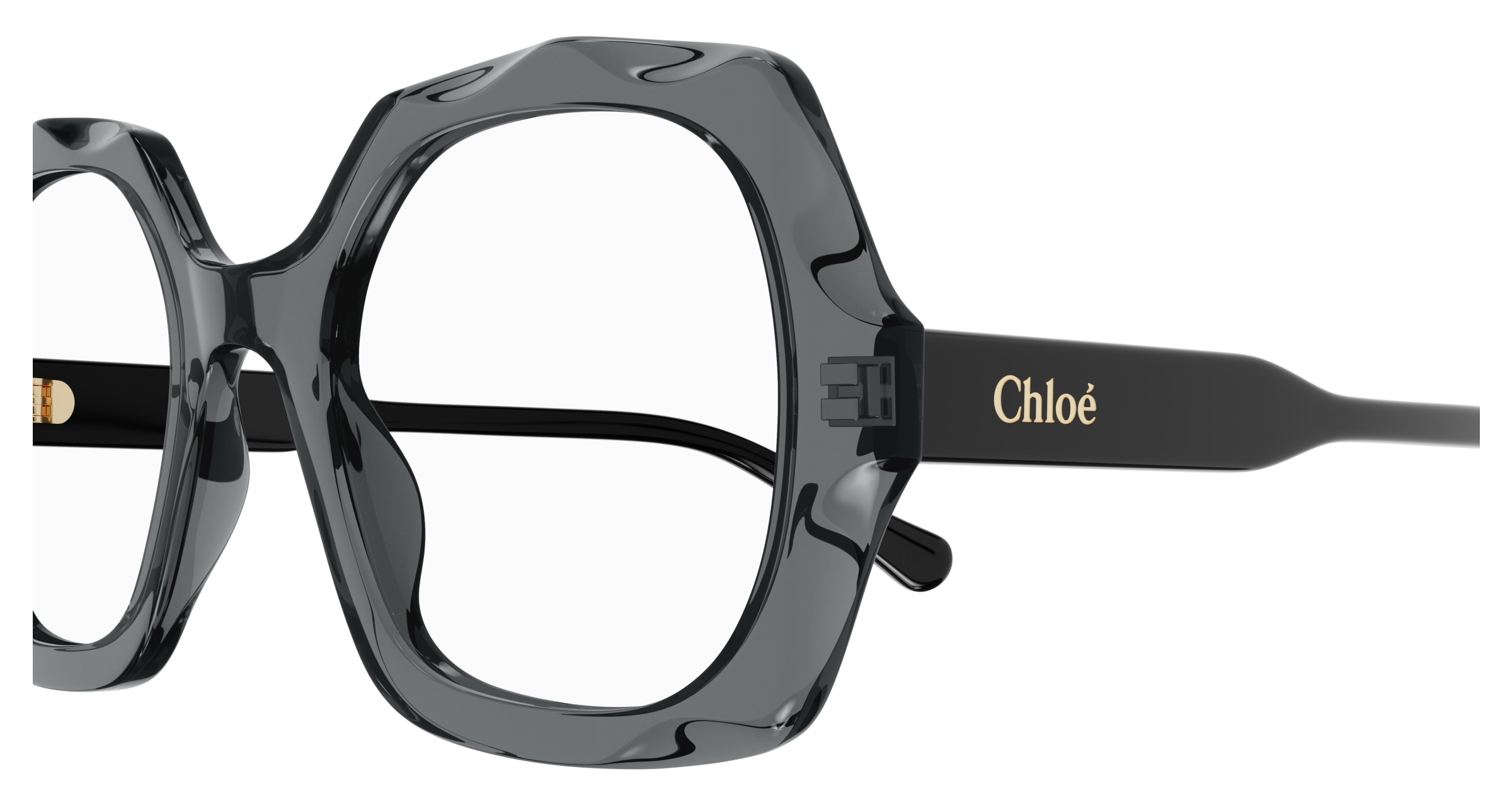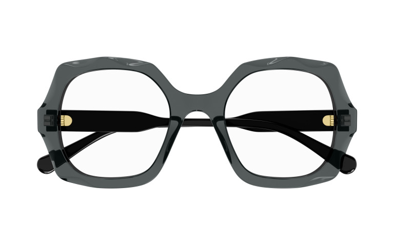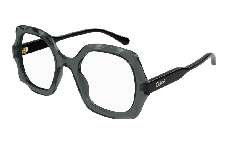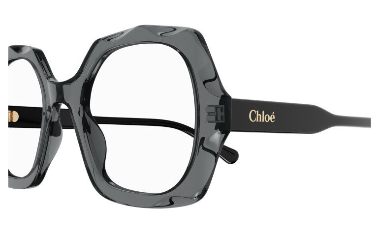 Monture carrée arrondie et oversize en acétate avec motif festonné sur le cercle. Cercle de couleur transparente associé à des branches unies ton sur ton. Logo Chloé gravé au laser et émaillé sur les branches.