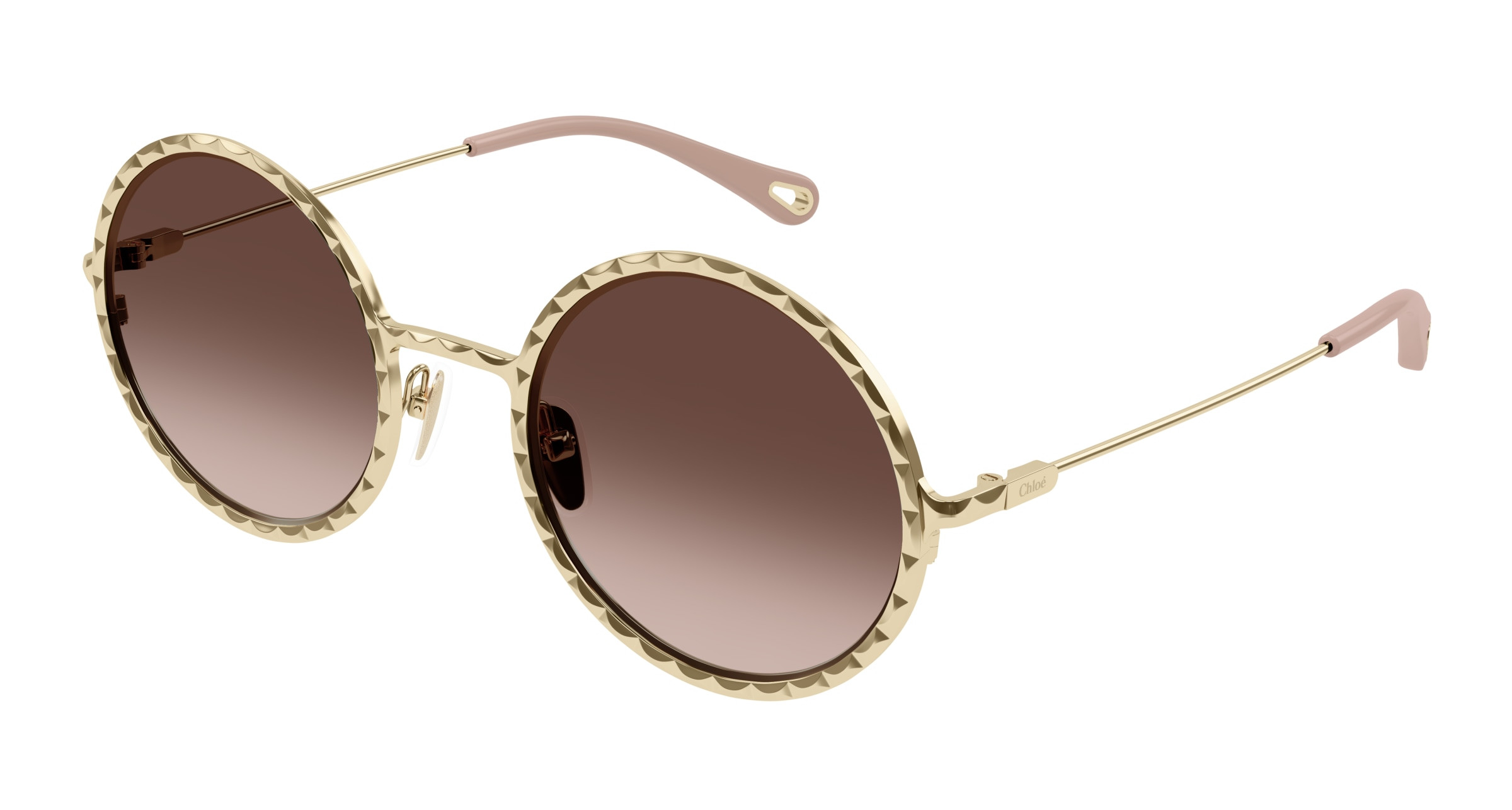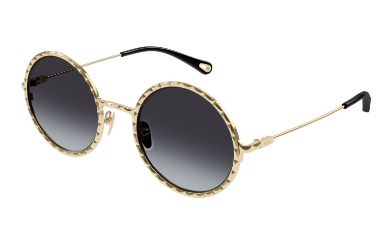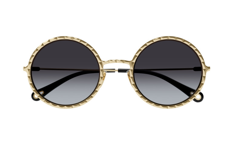 Monture ronde en métal au cercle doté d’un délicat effet festonné. Couleur or clair Chloé associée à des verres colorés à double dégradé. Manchons en acétate ornés d’un détail Chloé en métal sur l’extrémité.