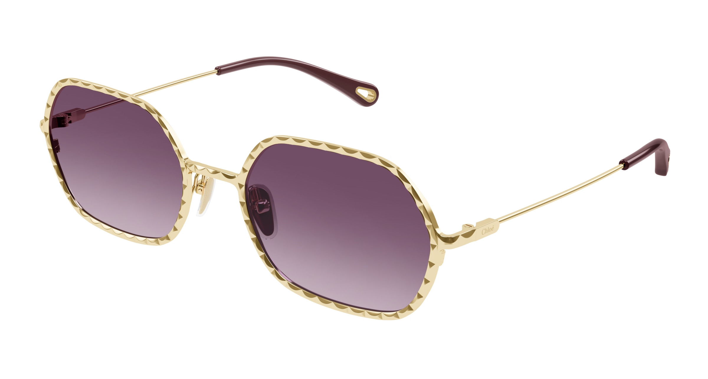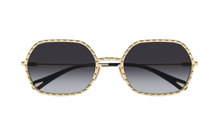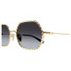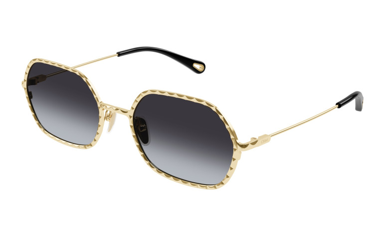 Monture rectangulaire étroite en métal au cercle doté d’un délicat effet festonné. Couleur or clair Chloé associée à des verres colorés à double dégradé. Manchons en acétate ornés d’un détail Chloé en métal sur l’extrémité.