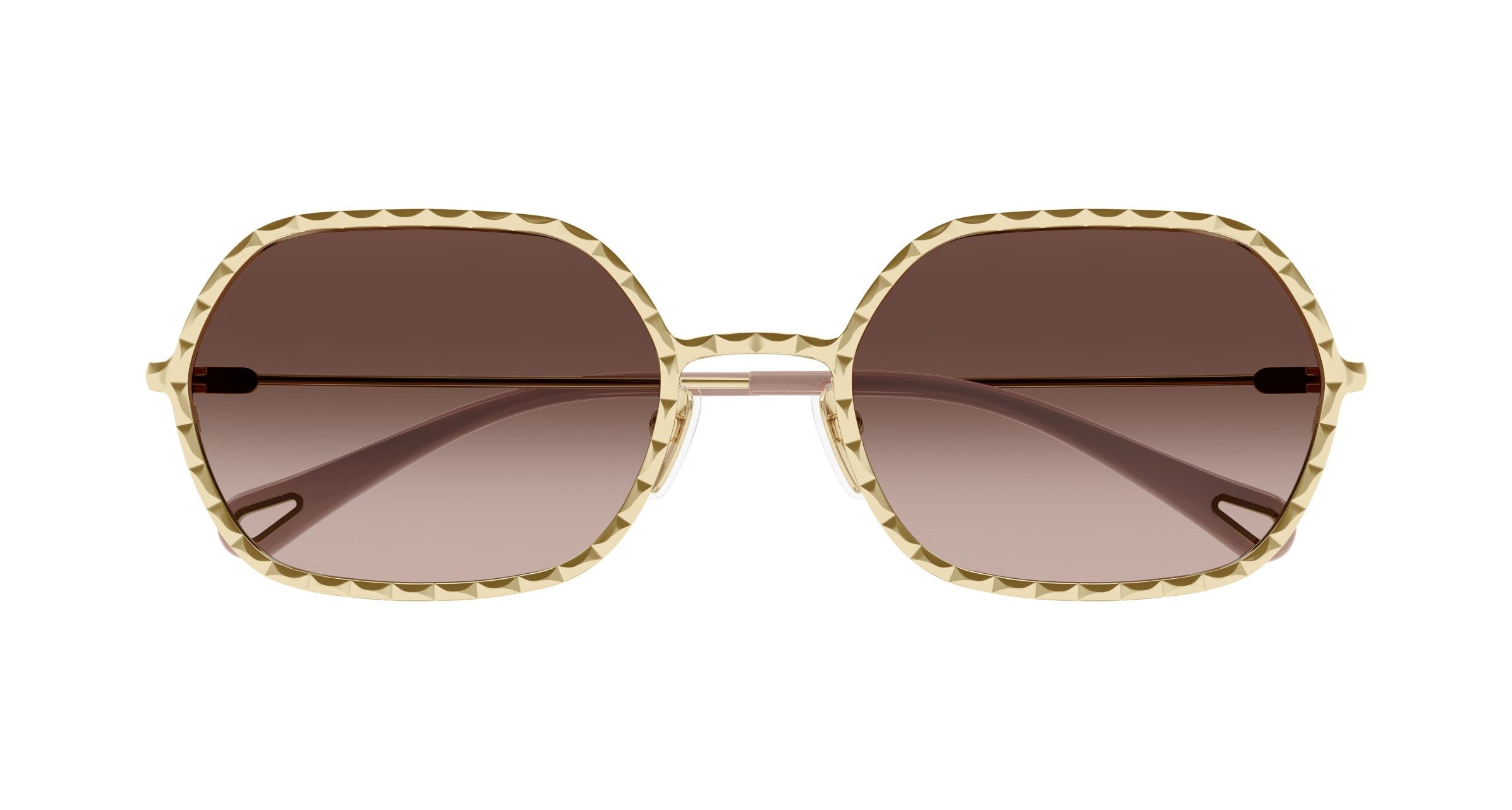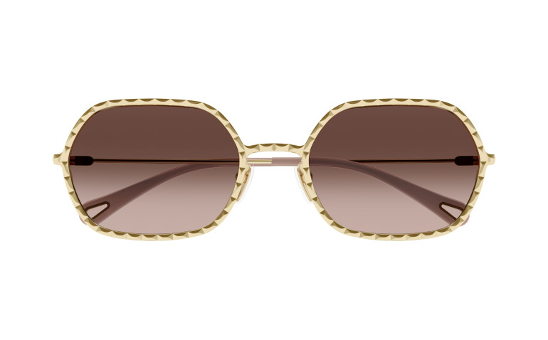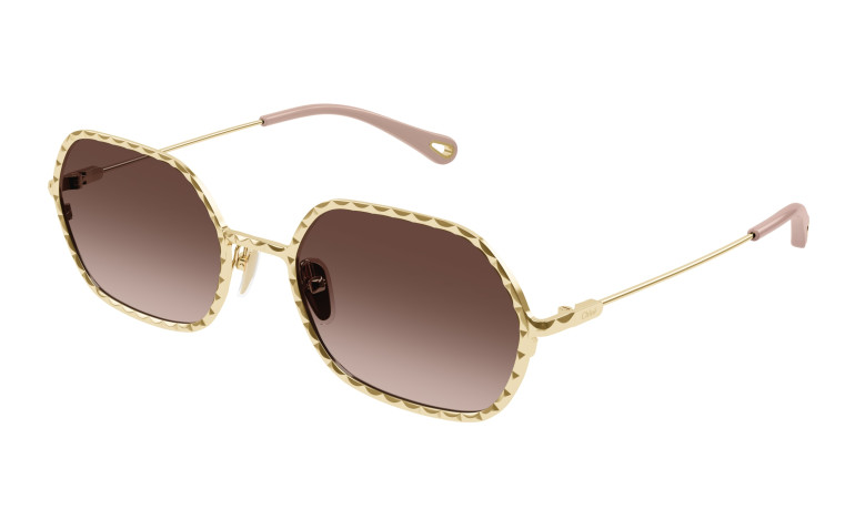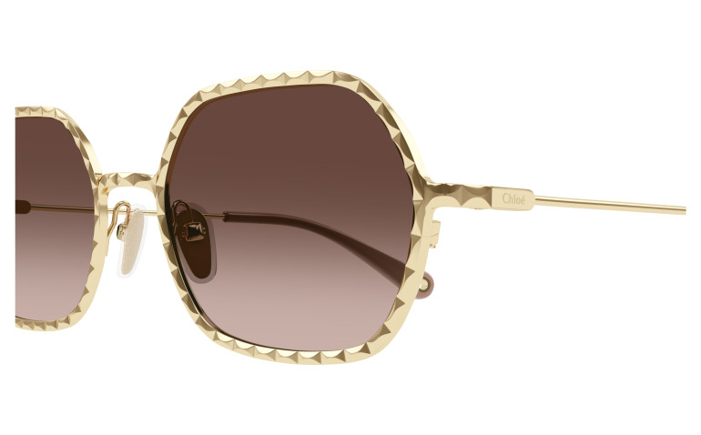 Monture rectangulaire étroite en métal au cercle doté d’un délicat effet festonné. Couleur or clair Chloé associée à des verres colorés à double dégradé. Manchons en acétate ornés d’un détail Chloé en métal sur l’extrémité.