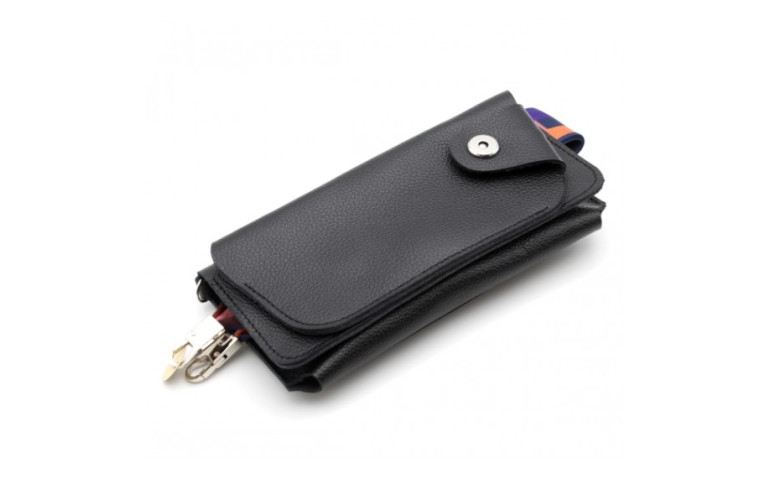 Petites sacoches en cuir avec rangements prévus pour téléphone, lunette et cartes.