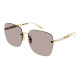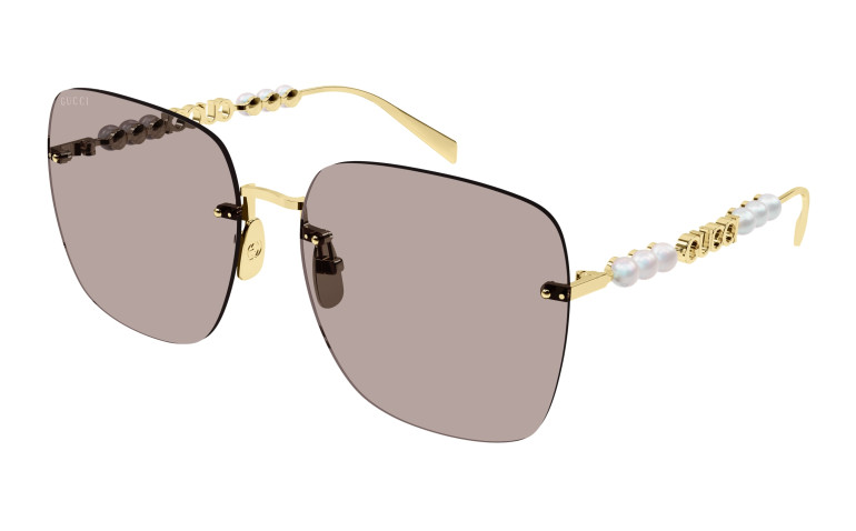 Construction féminine précieuse et chic caractérisée par de fines branches en métal ornées de perles qui encadrent le logo Gucci ajouré. Monture carrée percée oversize. Inscription logo Gucci ajourée sur les branches. Structures en métal doré et argenté associées à des verres foncés et colorés.