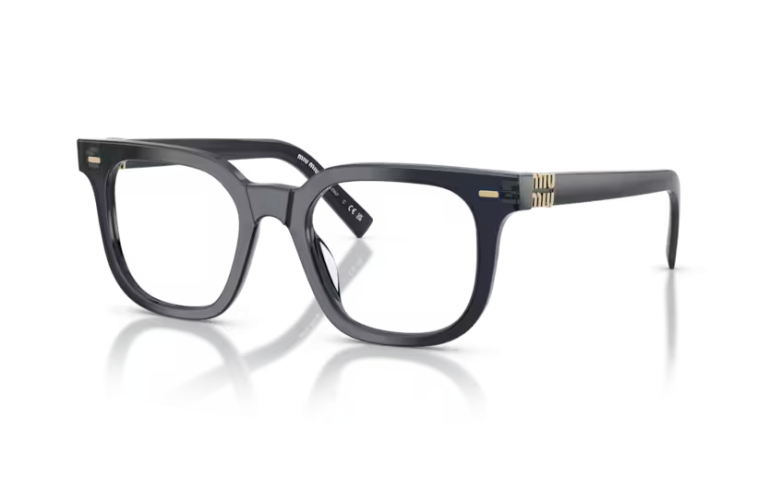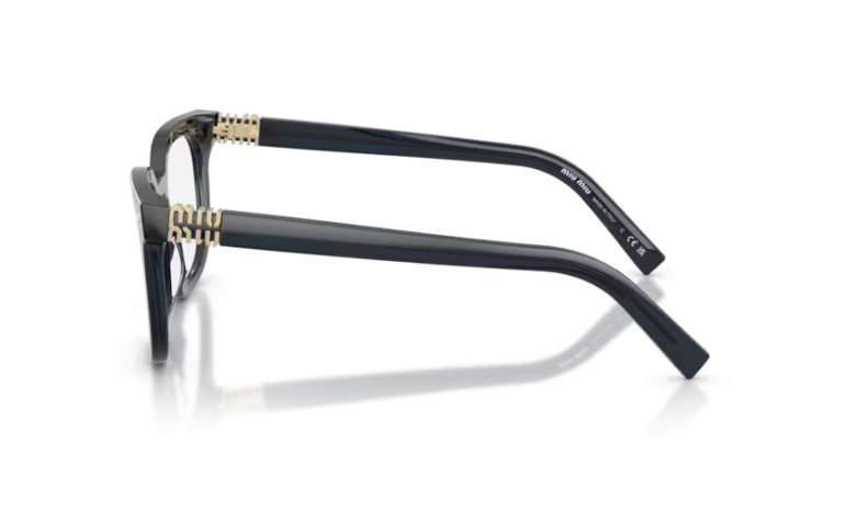 Miu Miu presents a square acetate model, offering a classic approach to eyeglasses. Shiny metal rivets stand out on the front, as does the unmistakable vertical logo affixed to each medium-sized temple.