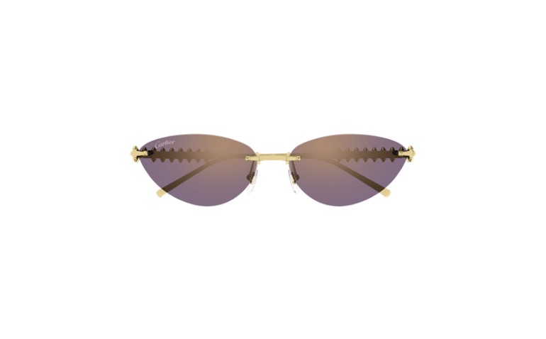 Le célèbre emblème Clash de Cartier est fidèlement reproduit pour la première fois dans la collection de lunettes sur les nouvelles branches distinctives en métal. Monture œil de chat féminine percée pour un look moderne. Chaque Picot peut bouger légèrement, reproduisant le mouvement caractéristique du bijou. Finition or précieuse enrichie du logo Cartier sur les manchons et de verres dédiés.