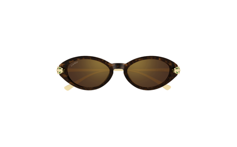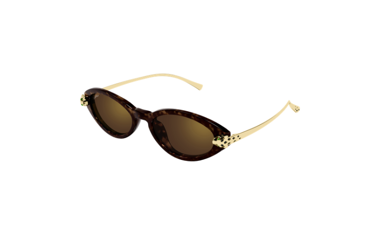 Nouvelle évolution en combi de Panthère Massai, inspirée de la joaillerie Cartier, caractérisée par une face en acétate associée à des branches métalliques. Monture féminine en amande, sophistiquée, pour un look élégant et authentique. Les branches en métal rappellent la tête et la queue de la Panthère et sont ornées de précieuses taches émaillées à la main. Finition précieuse en or associée à des coloris d'acétate variés.