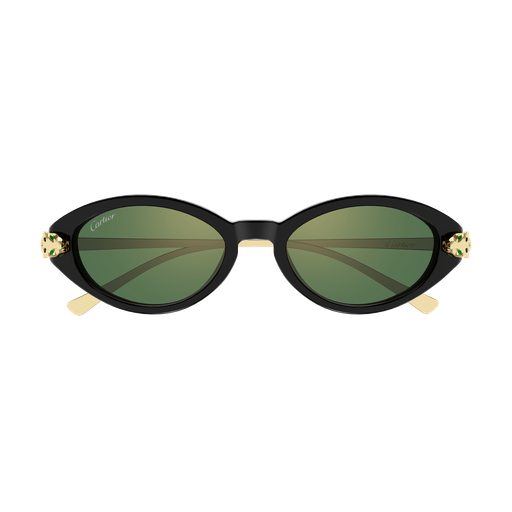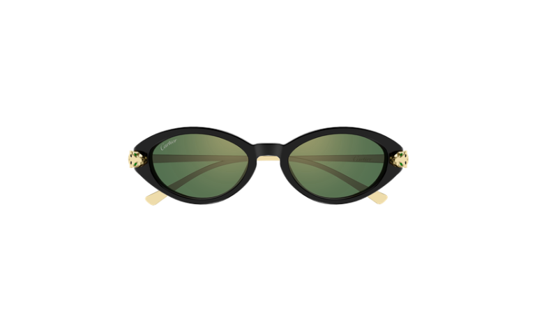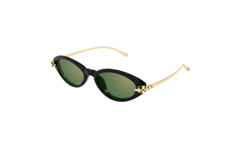 Nouvelle évolution en combi de Panthère Massai, inspirée de la joaillerie Cartier, caractérisée par une face en acétate associée à des branches métalliques. Monture féminine en amande, sophistiquée, pour un look élégant et authentique. Les branches en métal rappellent la tête et la queue de la Panthère et sont ornées de précieuses taches émaillées à la main. Finition précieuse en or associée à des coloris d'acétate variés.