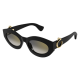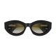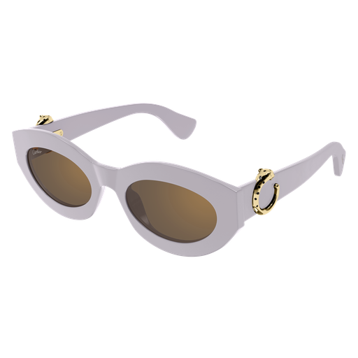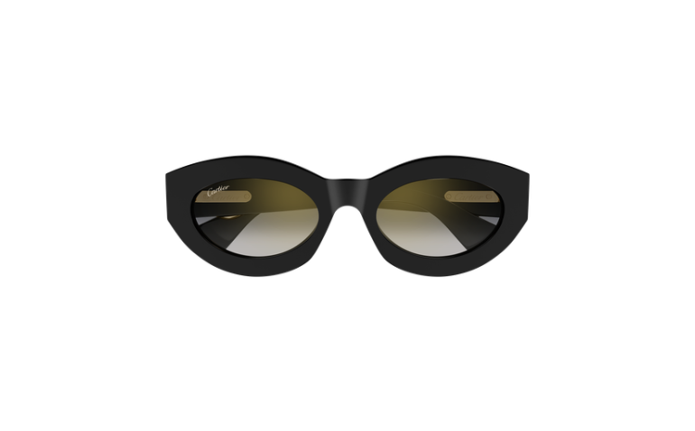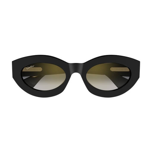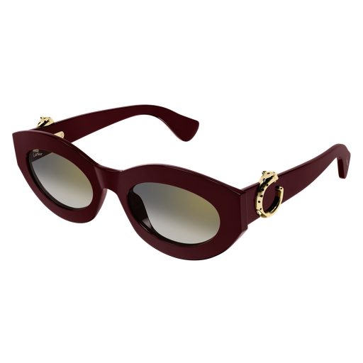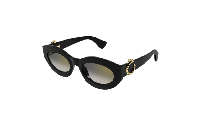 Esthétique légère de Panthère C, caractérisée par des profils fins en acétate et des proportions harmonieuses. Monture œil de chat arrondie féminine, parfaite pour un look contemporain et sophistiqué. Détail Panthère C tridimensionnel emblématique, rehaussé de taches émaillées à la main, faisant office de signature joaillière sur les branches. Finition précieuse en or.