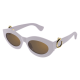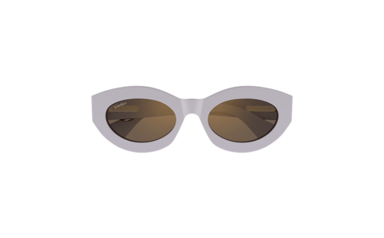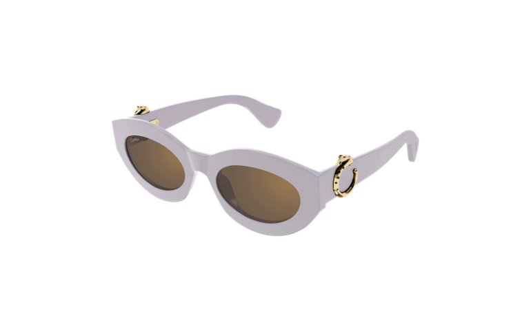 Esthétique légère de Panthère C, caractérisée par des profils fins en acétate et des proportions harmonieuses. Monture œil de chat arrondie féminine, parfaite pour un look contemporain et sophistiqué. Détail Panthère C tridimensionnel emblématique, rehaussé de taches émaillées à la main, faisant office de signature joaillière sur les branches. Finition précieuse en or.