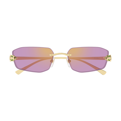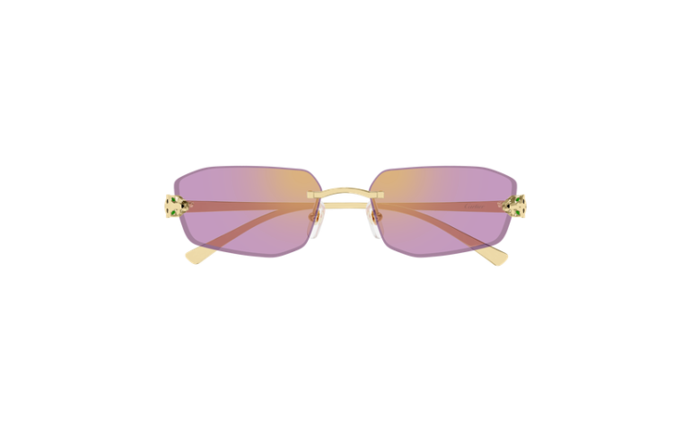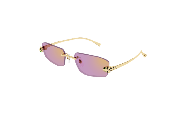 Esthétique réinterprétée, contemporaine et stylée, de Panthère Massai, inspirée de la joaillerie Cartier. Monture percée moderne et audacieuse, rehaussée d'une tête de Panthère tridimensionnelle sur la face pour un look unisexe affirmé. Les branches en métal rappellent la tête et la queue de la Panthère et sont ornées de précieuses taches émaillées à la main. Finition précieuse en or ou platine et verres aux couleurs captivantes.