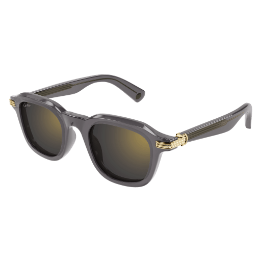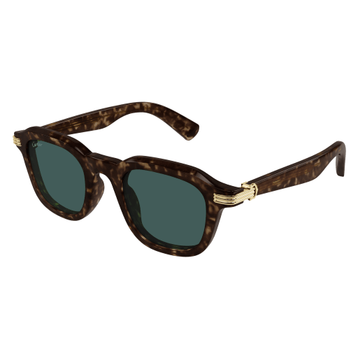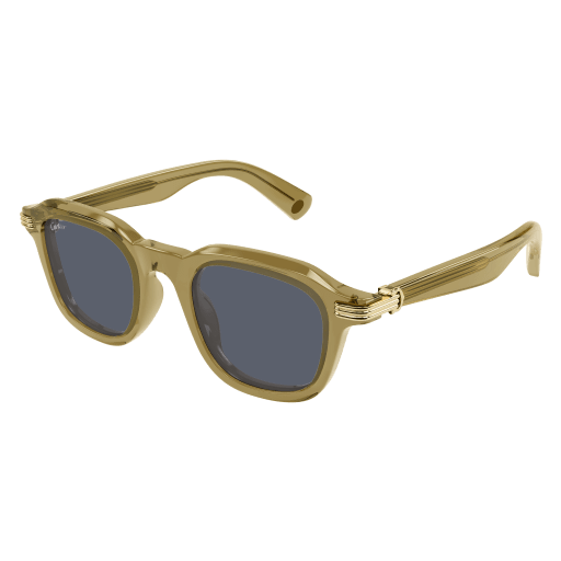 Amélioration de la structure Première en acétate, caractérisée par une âme en métal visible en transparence et ornée de l’emblématique détail Godron le long des branches. Monture carrée moderne rehaussée par l’association iconique du motif Godron et du C de Cartier, élément esthétique et fonctionnel de la charnière. Les acétates transparents de certaines références mettent davantage en valeur l’âme métallique ornée de l’icône Godron. Finition précieuse en or ou en platine, plaque ornée du logo Cartier Double C sur les manchons inspirée des modèles anciens.