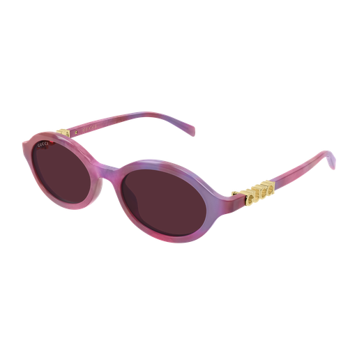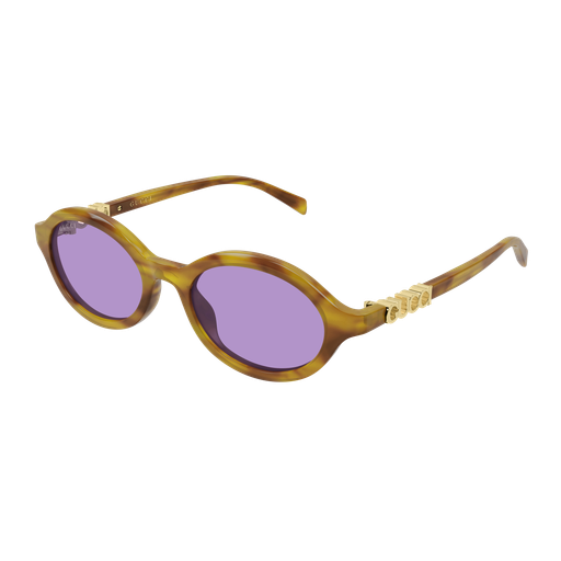 Construction légère en acétate, dotée d'un logo lettering tridimensionnel sur les deux branches. Monture ovale à vocation commerciale. Différentes déclinaisons havane et options de logo strassé.