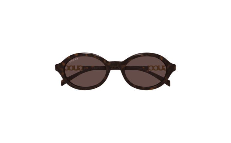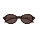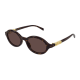 Construction légère en acétate, dotée d'un logo lettering tridimensionnel sur les deux branches. Monture ovale à vocation commerciale. Différentes déclinaisons havane et options de logo strassé.