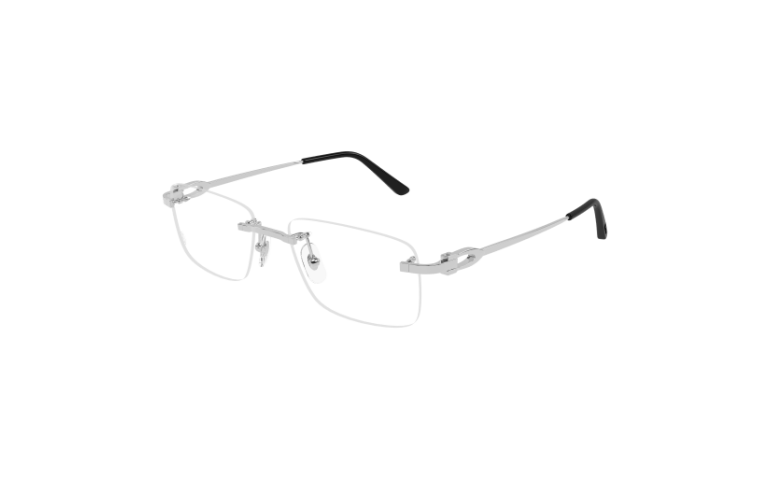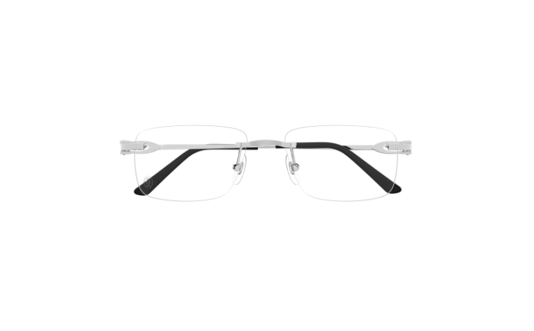 Réinterprétation contemporaine et sophistiquée de la branche historique Décor C en version métal. Monture rectangulaire souple classique et polyvalente, non cerclée. Détail iconique Décor C comme élément esthétique et fonctionnel de la charnière en métal. Finition précieuse en or ou platine associée à des embouts en acétate avec logo Cartier pour plus de confort et Double Décor C sur les plaquettes de nez.